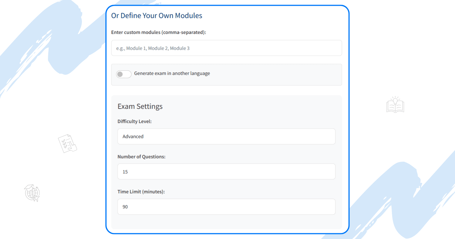 - If your audience speaks another language, no worries—PrepareBuddy lets you generate the exam in multiple languages.