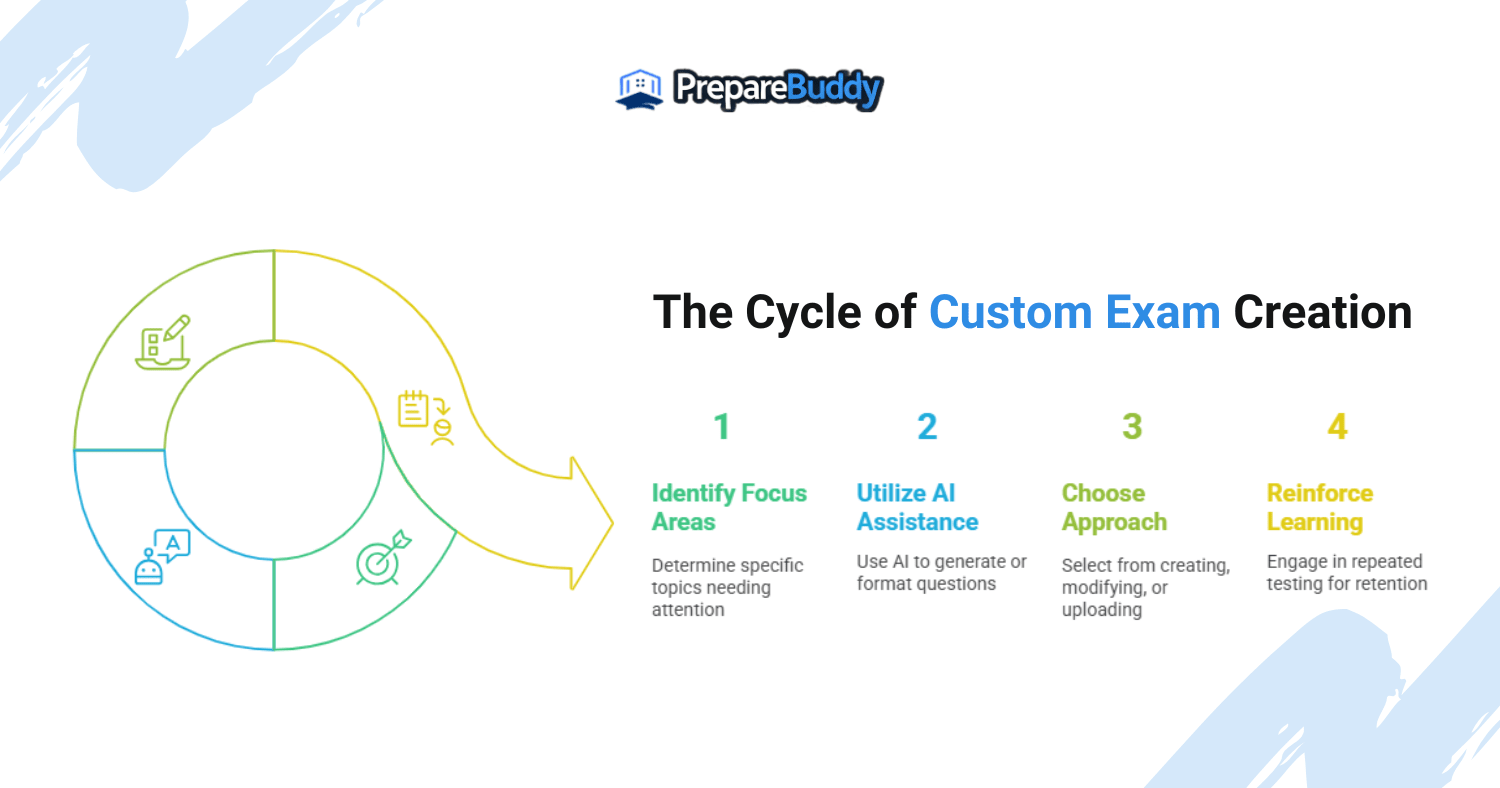 That’s exactly what PrepareBuddy solves. With its Custom Exams, you can create tailored tests, use AI-generated questions, and get instant feedback—all in one place. No more sifting through unreliable practice tests or waiting for results.