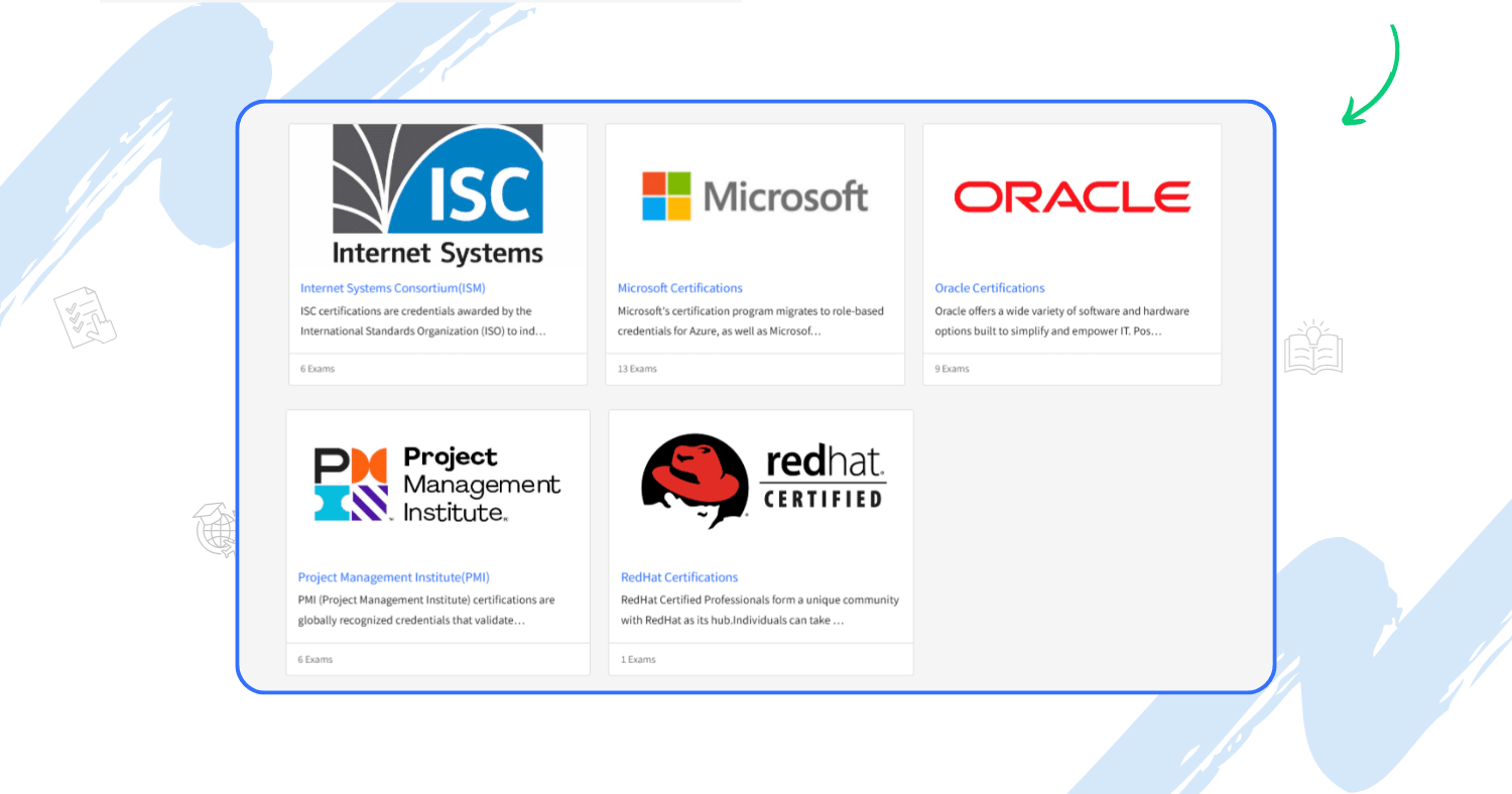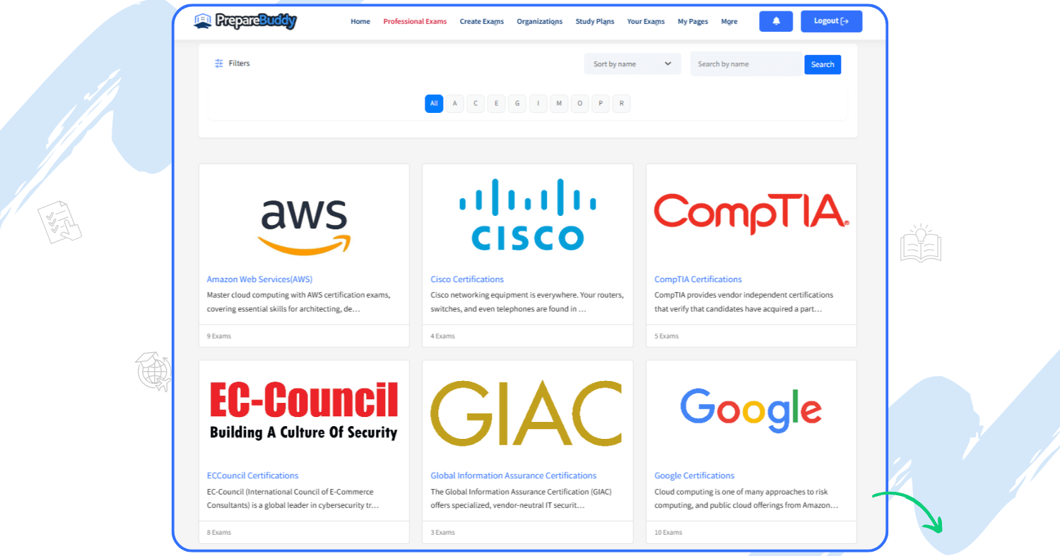 Start by visiting the Professional Exams section on PrepareBuddy. Here you’ll find a categorized list of major professional certifications, including: